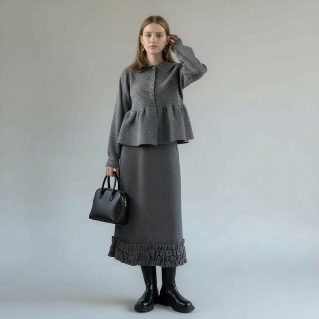 ふんわりとした温もりニットに、すとんと落ちる上品なシルエット。 大人の女性にそっと寄り添う フェミニンフリルスカート が登場です。 落ち着いたチャコールグレーに、裾のさりげないフリルデザインがアクセント。 甘すぎず、可愛さもしっかり残した“ちょうどいいバランス”で、 どんなトップスとも合わせやすい万能アイテムです。 伸縮性のある柔らかな生地で、歩くたびに揺れる裾が女性らしさを引き立てます。 ブーツ合わせで冬の装いが一気にこなれた印象に。 ⸻ おすすめポイント • 裾のフリルが大人可愛いアクセントに • 広がりすぎず、すっきり見えるシルエット • ストレスフリーな柔らか素材で寒い日も快適 • ニット・スウェット・シャギー系トップスとも相性抜群 ⸻ こんな方におすすめ • 大人っぽさと可愛さ、両方欲しい • 体のラインを拾いすぎないスカートが好き • 冬でもフェミニンさを楽しみたい • 1枚で“きれいめコーデ”が完成するアイテムが欲しい サイズ・容量 • ウエスト:62cm(最大78cm) • ヒップ:106cm • 裾巾:60cm • 総丈:74cm ※平置き採寸のため、多少の誤差がある場合がございます。 ⸻ 素材・仕様 • 素材: ポリエステル92%、レーヨン8% 色 チャコール #スカート#チャコール #フリル#大人かわいい#クリスマスコーデ