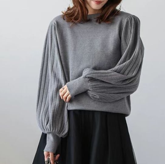 ニットトップス レディース ラウンドネック ランタンスリープ グレー