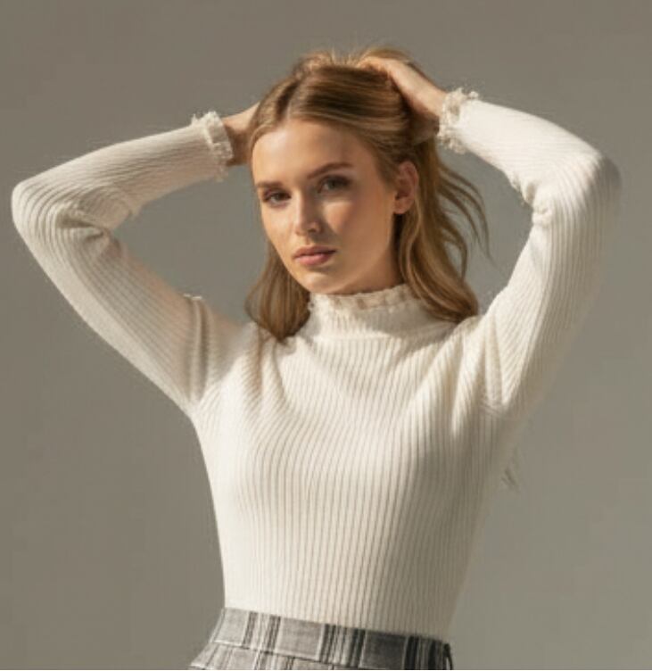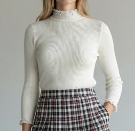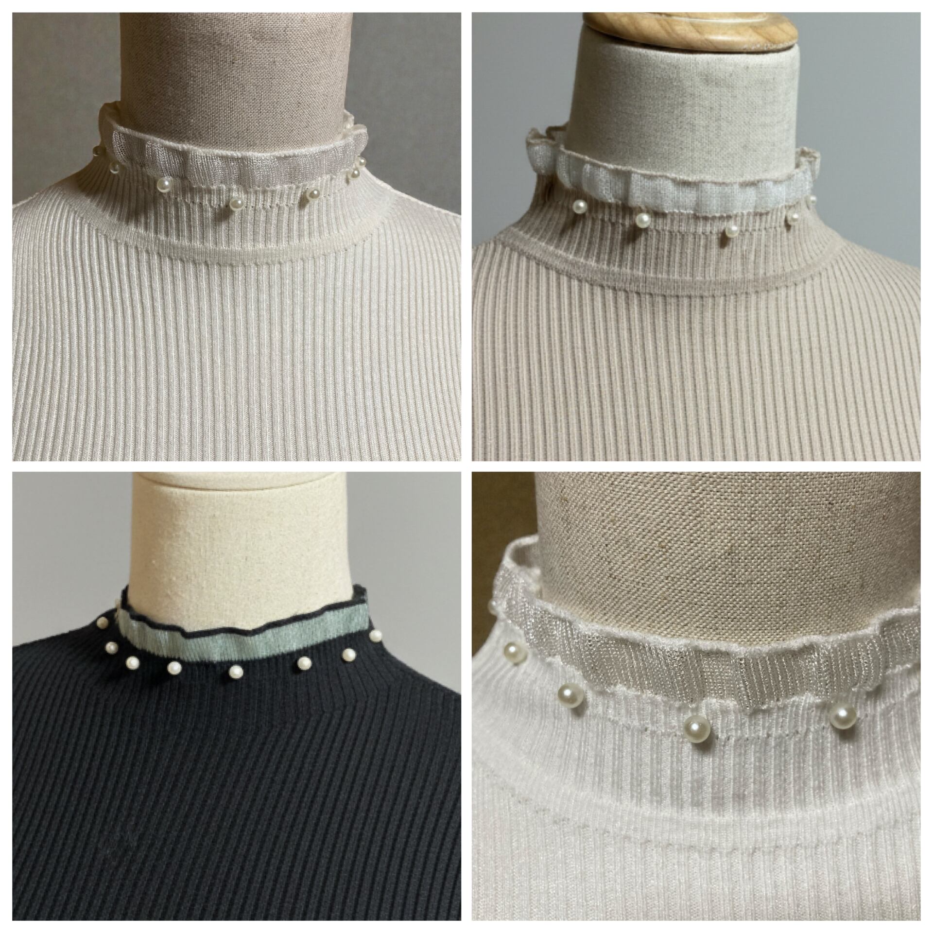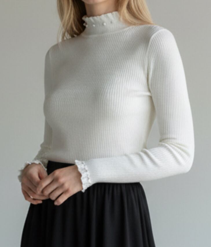 女性らしさを引き立てる、上品パール×フリルハイネックのリブニットトップス。