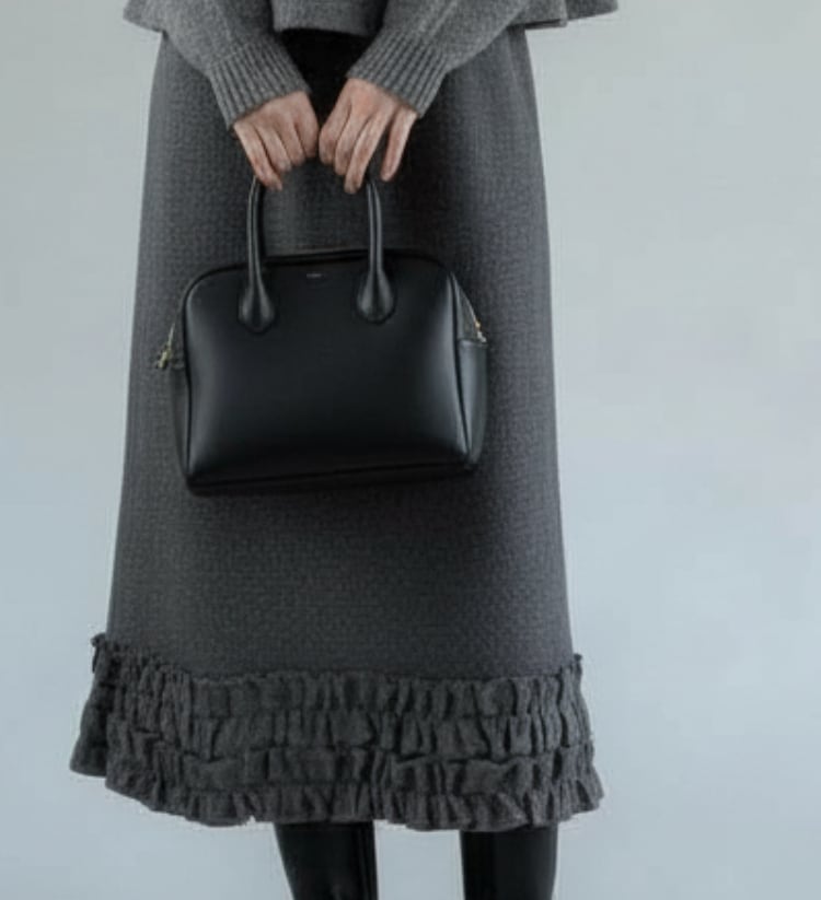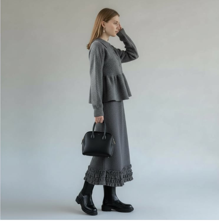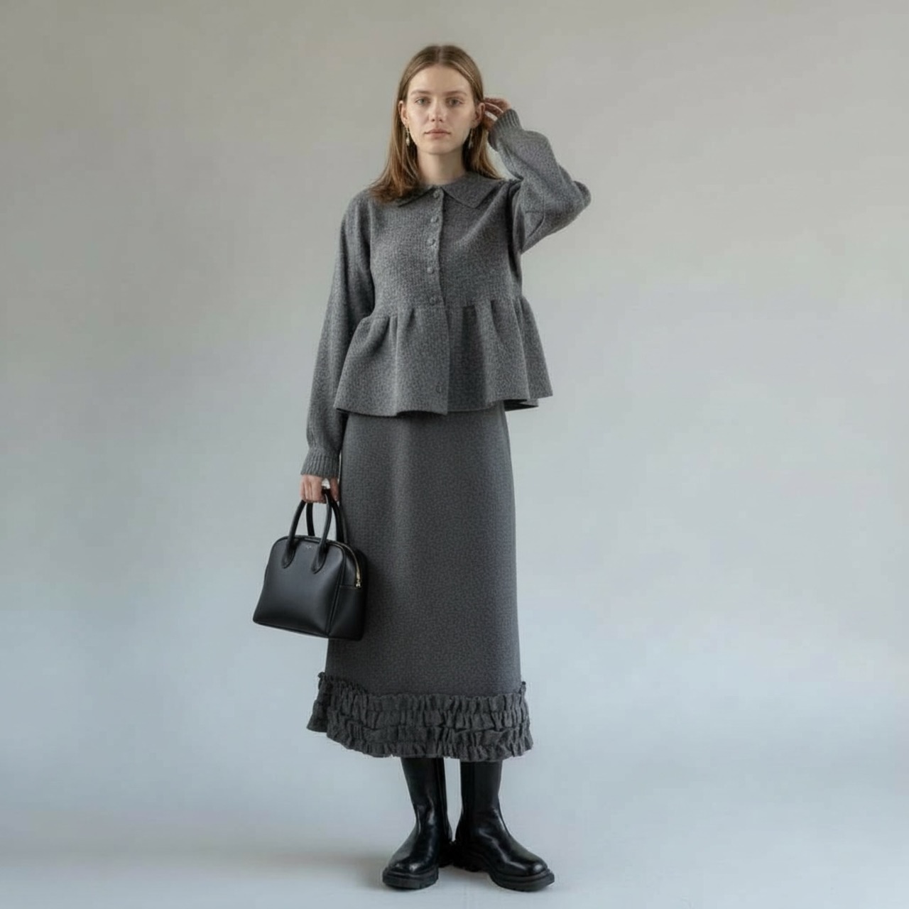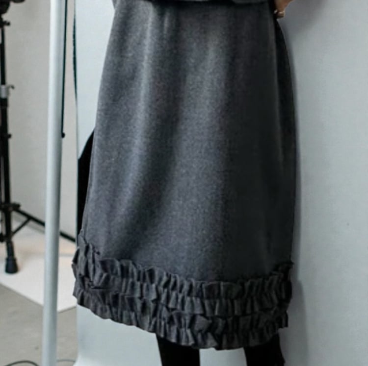 落ち着いたチャコールグレーに、裾のさりげないフリルデザインがアクセント。
