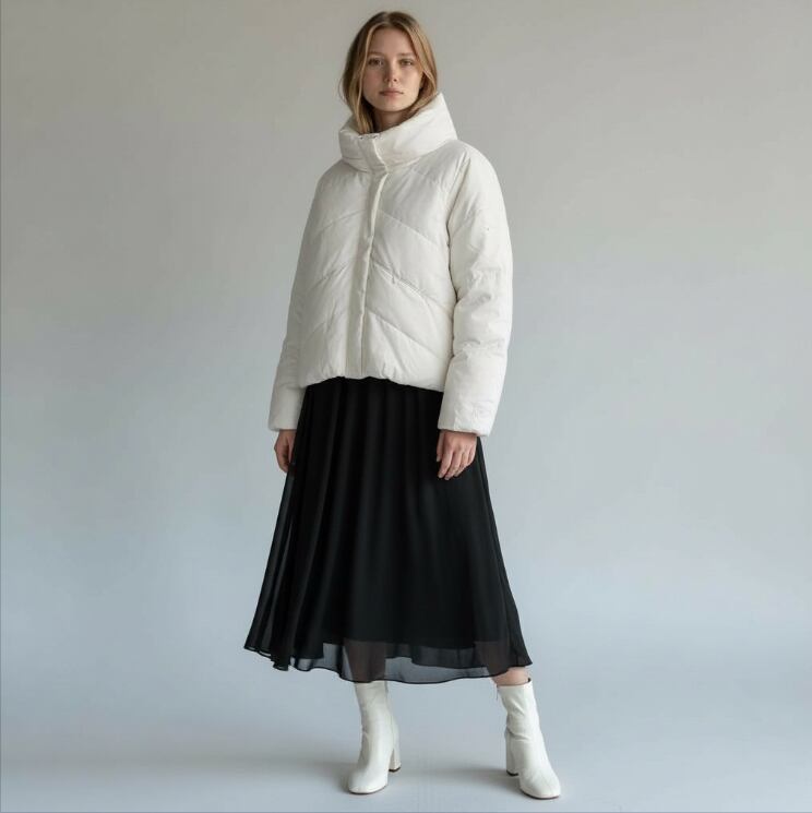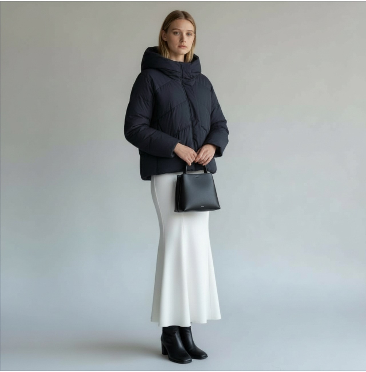 斜めに入ったキルティングラインが、ボリュームを抑えつつすっきりとしたシルエットを演出。