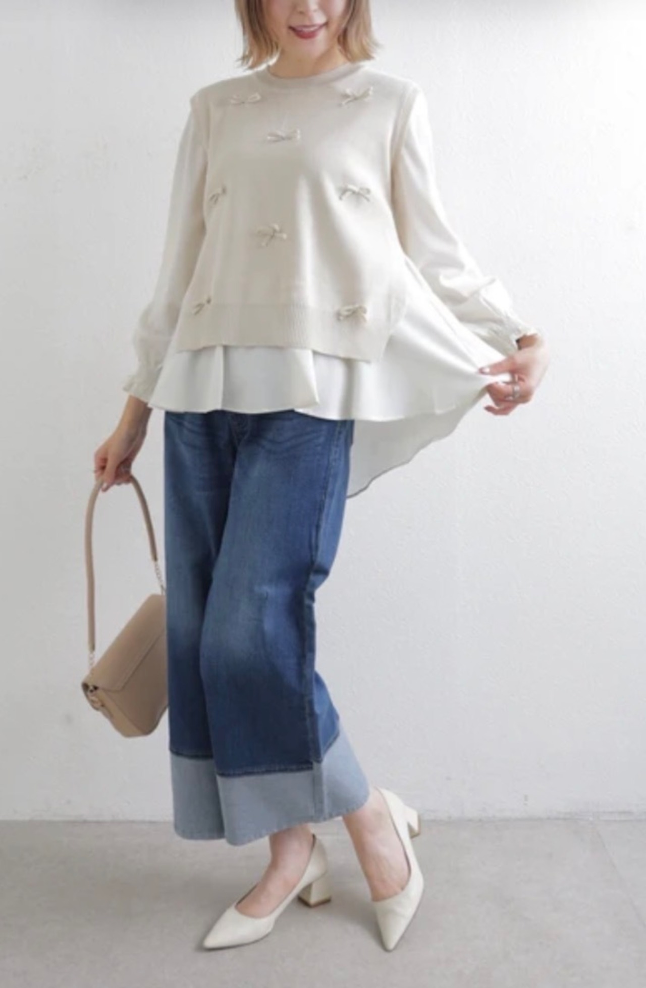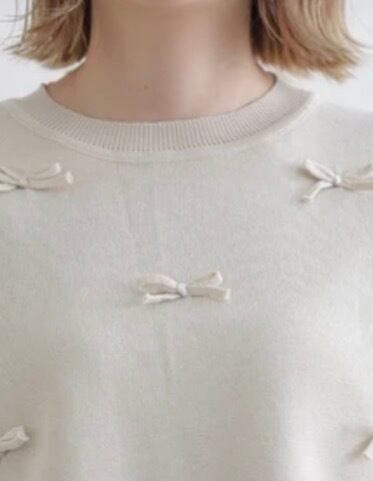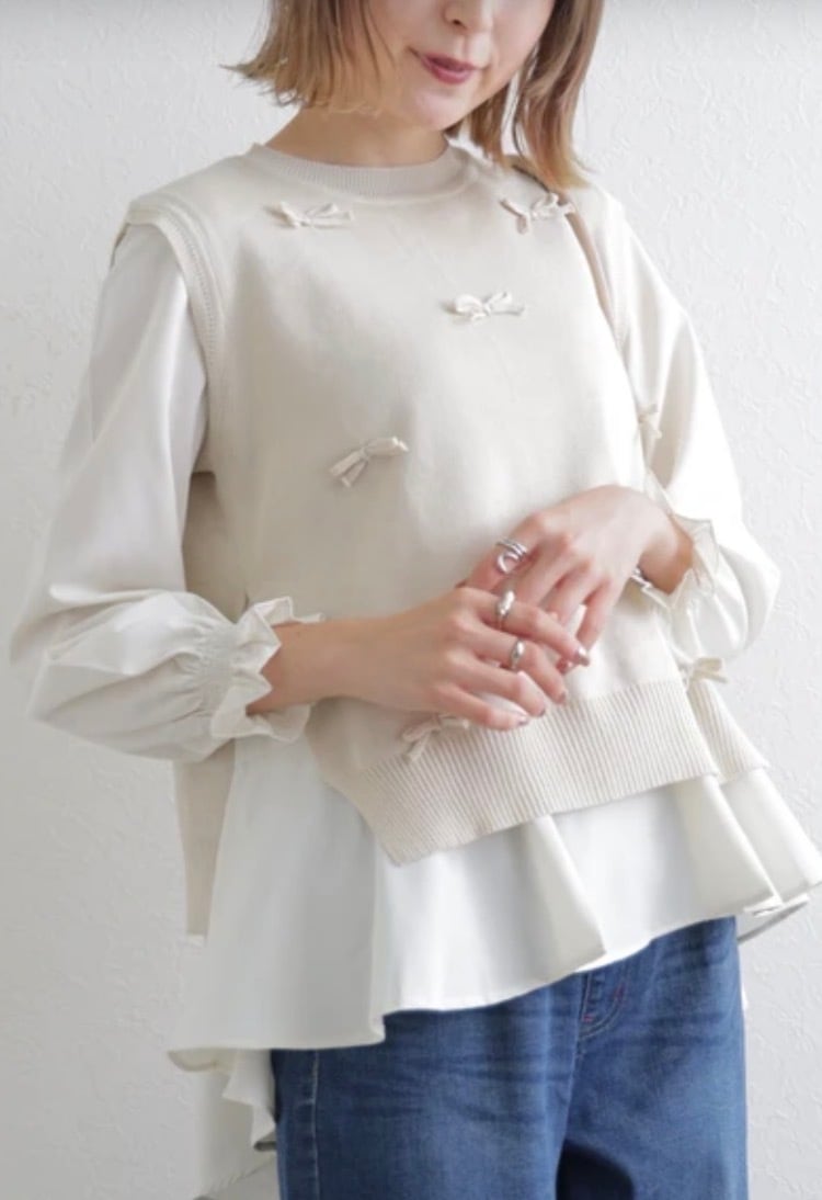 立体感のあるリボンモチーフが散りばめられたベストと、ふんわり揺れるフレアシルエットの長袖プルオーバーがセットになった、大人可愛いレイヤードトップス。
